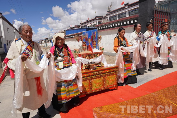 位于薩迦縣扯休鄉(xiāng)東北部的嘎吉林村,是庫區(qū)搬遷新村,2020年3月,全村139戶769人從海拔4000多米的土坯房搬遷到了這里海拔3800米的新房。得知班禪要來的喜訊,嘎吉林村村民及信教群眾身著節(jié)日盛裝、手捧潔白哈達(dá),一早就自發(fā)聚集在村廣場(chǎng)上迎候班禪。村民旦珍高興地對(duì)記者說道:“自從搬到這兒以后,政府給我們每人分了5.5畝田地,每戶人家都享受著國家搬遷優(yōu)惠政策,住上了福利幸福房。尤其是有了村里的集體合作社,再也不用像以前那樣單打獨(dú)斗各家做各自的事了。現(xiàn)如今,無論是生活還是經(jīng)濟(jì)收入都一年比一年好?!?/p>