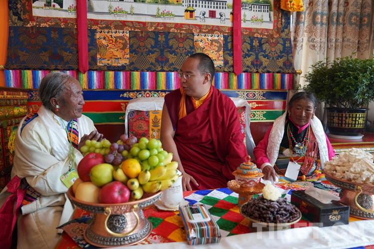 中午時(shí)分,班禪結(jié)束了對(duì)拉洛水利的調(diào)研,到扯休鄉(xiāng)嘎吉林村看望搬遷群眾,熱情的村民迎上前來向班禪獻(xiàn)上哈達(dá)和切瑪,班禪高興地?fù)]手致意。班禪緩步來到村民歐珠老人家。班禪為家里的老人摸頂賜福,端坐在歐珠家人當(dāng)中,詳細(xì)詢問搬遷后的生產(chǎn)生活情況。得知?dú)W珠老人一家在搬遷后住房條件、生活條件等都有顯著改善,班禪感到十分欣慰。