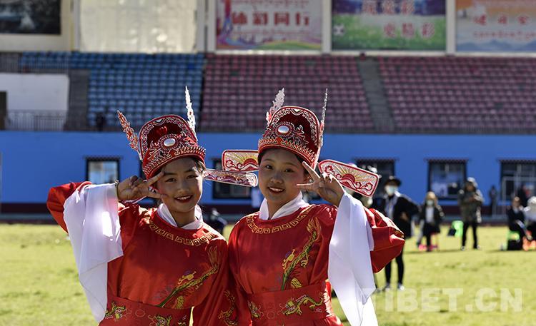 臨時的化妝間里,畫好妝容的學生們漸次走出,準備候場。索朗曲珍和白瑪曲吉臉上沒有一絲緊張的表情。正上高二的她們,學習黃梅戲已經有一段時間了,為了即將到來的演出,也已練習許久。