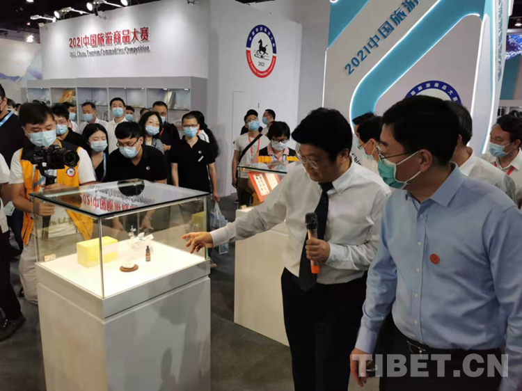 圖為國家文化和旅游部副部長杜江(右)聽取中國旅游協(xié)會旅游商品與裝備分會秘書長陳斌(左)介紹獲2021中國旅游商品大賽銀獎的“西藏禮物”文創(chuàng)產(chǎn)品“瑪尼石香氛”。