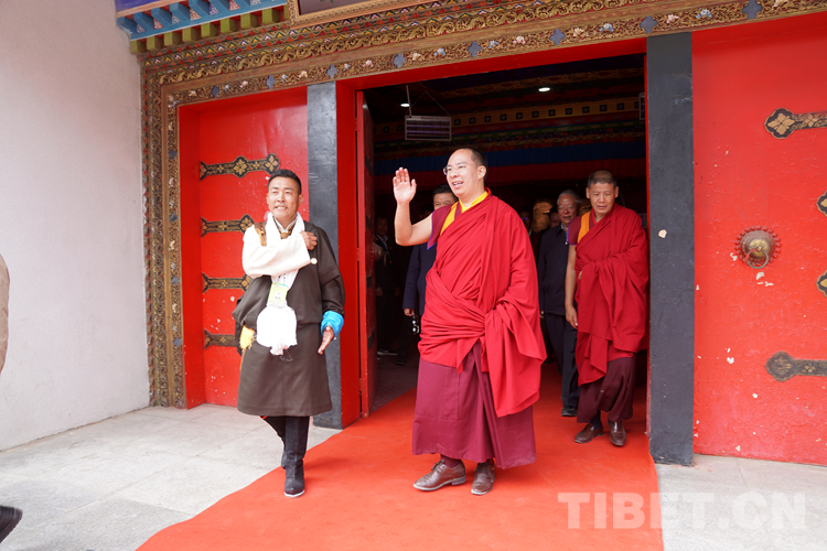 紀(jì)念館外,聞訊而來的信教群眾手捧哈達(dá),迎候班禪并恭?!霸鞯吕铡薄0喽U在走進紀(jì)念館前后,揮手向群眾回以祝福。