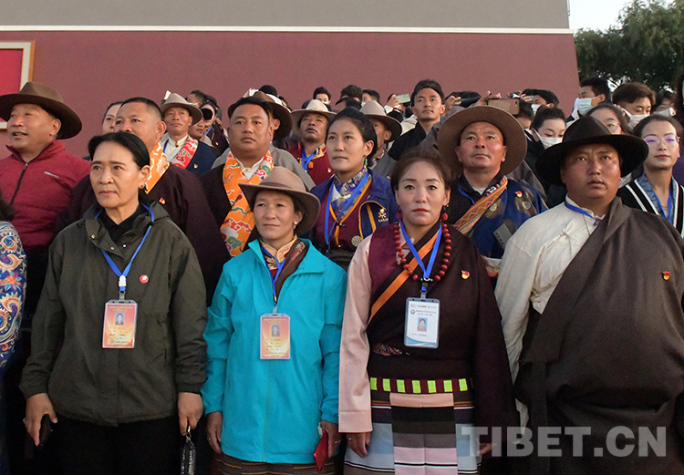 當(dāng)日凌晨,懷著萬分激動的心情,來自西藏自治區(qū)山南市貢嘎縣森布日極高海拔生態(tài)搬遷安置點的基層干部身著民族盛裝,來到北京天安門廣場,站在東觀禮臺上靜靜地等候著五星紅旗冉冉升起。