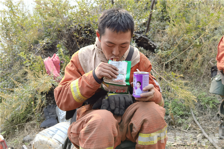 圖為指戰(zhàn)員就地食用隨身攜帶的方便食品