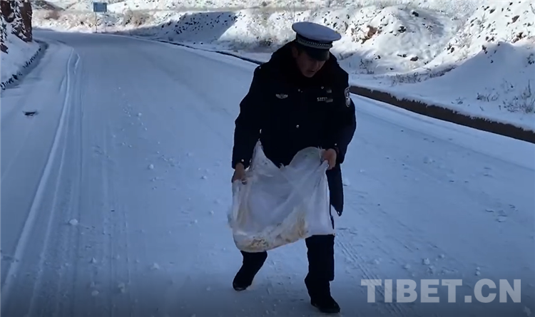 2018年3月,國(guó)道317突然遭遇了暴雪天氣,許多群眾和車輛被困在了矮拉山山頂,扎西四郎跟著隊(duì)友們?cè)诹阆氯喽鹊膼毫迎h(huán)境下堅(jiān)守了28天。令扎西四郎印象最深刻的是有一次,因?yàn)檐囎記](méi)辦法通行,隊(duì)長(zhǎng)指揮民警帶群眾下山。當(dāng)時(shí),有一位要去拉薩的老奶奶腿腳不方便,她自己根本就沒(méi)辦法走動(dòng),扎西四郎就和桑珠一起輪流背著老人下山,雖然中間滑倒了幾次,可還是把老人背到了能通車的安全位置,老人為了表達(dá)感激,還專門給他們留下了拉薩的住址和聯(lián)系電話。