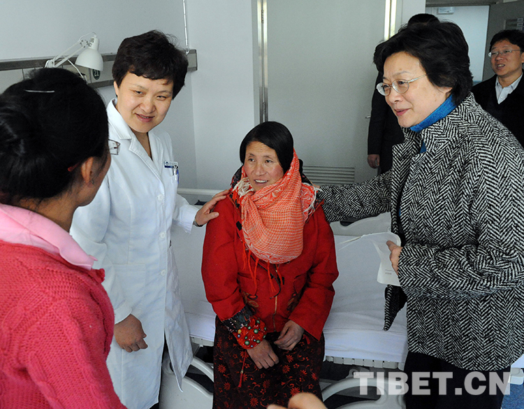 這是時(shí)任全國(guó)婦聯(lián)副主席甄硯(右一)受時(shí)任十一屆全國(guó)人大常委會(huì)副委員長(zhǎng)陳至立委托,到北京口腔醫(yī)院看望斯求卓瑪,并送來慰問金(唐召明2010年4月14日攝)