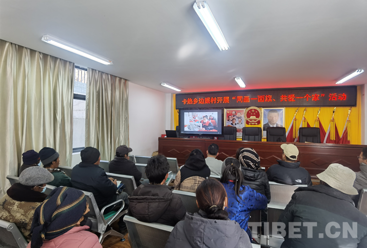 圖為卡熱鄉(xiāng)6個村(居)第一書記和邊據(jù)村黨員、群眾代表正在觀看講述西藏各族人民愛護國旗的視頻