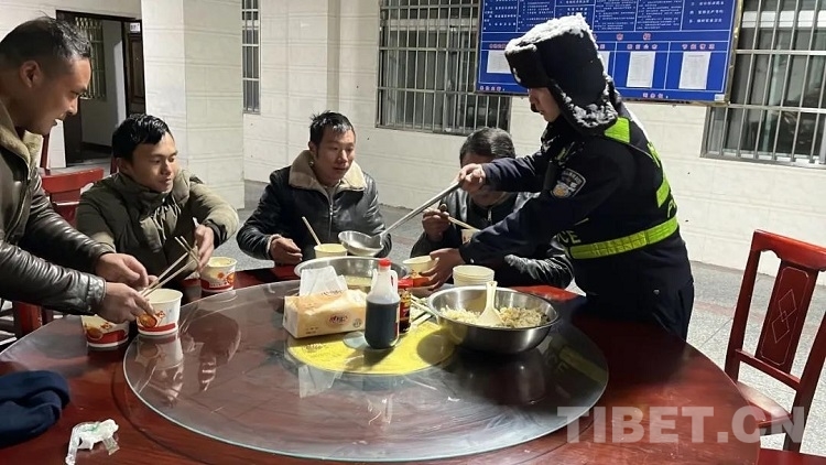 圖為民警們和被困人員返回檢查站后吃上了熱騰騰的飯菜