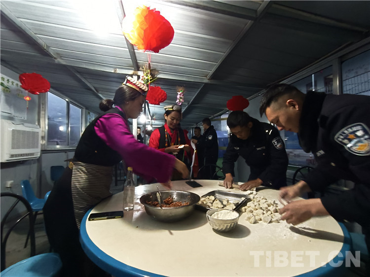 “阿久(藏語音譯:大叔),包餃子得講究手法,你要把餡放皮中央?!泵窬悋?guó)云邊講解邊演示,一個(gè)個(gè)餃子范本整整齊齊擺在托盤上。香腸、臘肉、餃子、羊肉、雞湯、糌粑、火鍋.....一桌藏漢式的年夜飯準(zhǔn)備完畢,大家圍坐在圓桌旁,舉杯共祝新春,濃濃的年味兒在夏爾巴第一村溢出,教導(dǎo)員康林感嘆道:“雖然春節(jié)不能回家,但是我們就是一個(gè)大家,祝大家新年快樂,扎西德勒!”