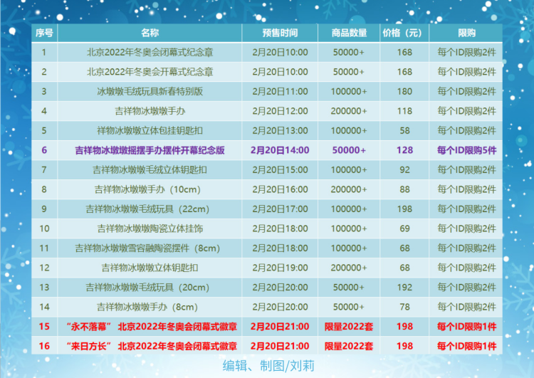 記者整理出了2月20日開放預售的所有特許商品的有關情況,此前遺憾沒能擁有冰墩墩的網(wǎng)友們,這次應該有望實現(xiàn)“一戶一墩”。
