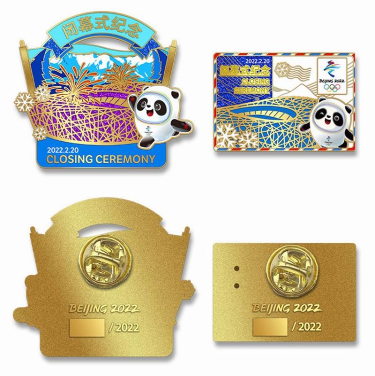 “永不落幕”北京2022年冬奧會閉幕式徽章一套兩枚,專門注明是線上專供款。兩枚徽章都以吉祥物冰墩墩、國家體育場“鳥巢”為主體,飾以雪山、雪花等,材質(zhì)均為鋅合金,采用軟琺瑯、金蔥粉印刷,以三折卡紙包裝,限量2022套。不規(guī)則形徽章高5cm、寬5.6cm,寓意賽事圓滿落幕;長方形徽章高3.1cm、寬4.5cm,以明信片造型表達了中國向世界展示冬奧會精彩賽事的愿望。