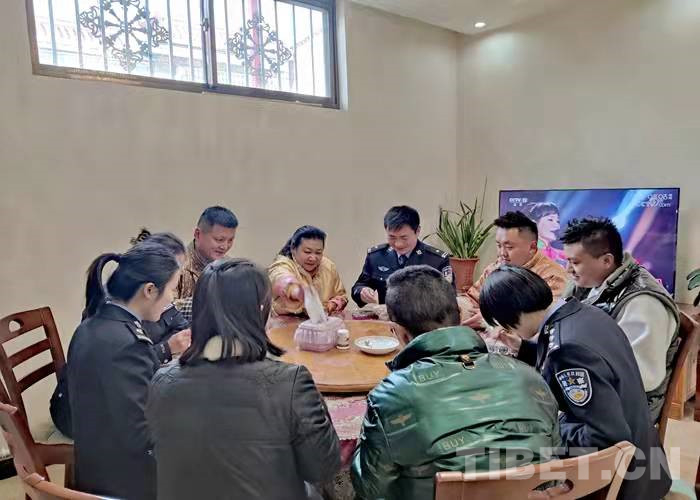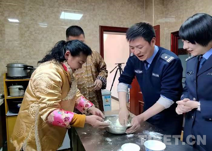 廚房里香味四溢,叔叔阿姨正在熬制古突(一種用牦牛肉湯熬煮的面食),民警們和面、搓面疙瘩,大家有說有笑分享著過藏歷新年的喜悅?!澳銈冞^年也要堅守崗位,今天咱們就一起吃‘古突’開開心心過個年。一會咱們還要在面疙瘩里包辣椒、毛線、羊毛、硬幣等9樣東西。吃到這些東西的人要即時吐出。”民警們聽到白瑪阿姨講的這些感到十分有趣。