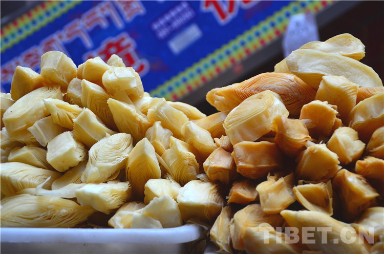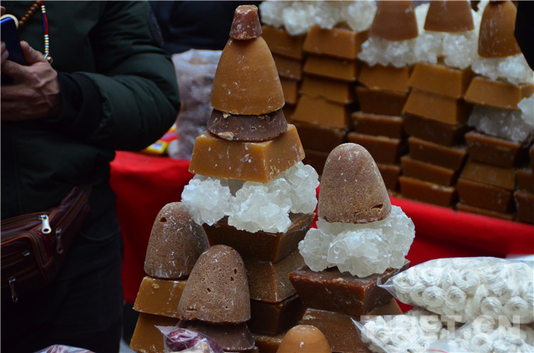 商城一層是一個(gè)年貨市場(chǎng),一層一層壘起來(lái)的切瑪盒、不同顏色和形狀的卡塞、堆成寶塔形狀的紅糖、花盆里裝著的青稞苗……在那拿出皮尺量的,是在購(gòu)買香布,藏歷新年到來(lái)時(shí)家家戶戶都會(huì)更換新的香布。