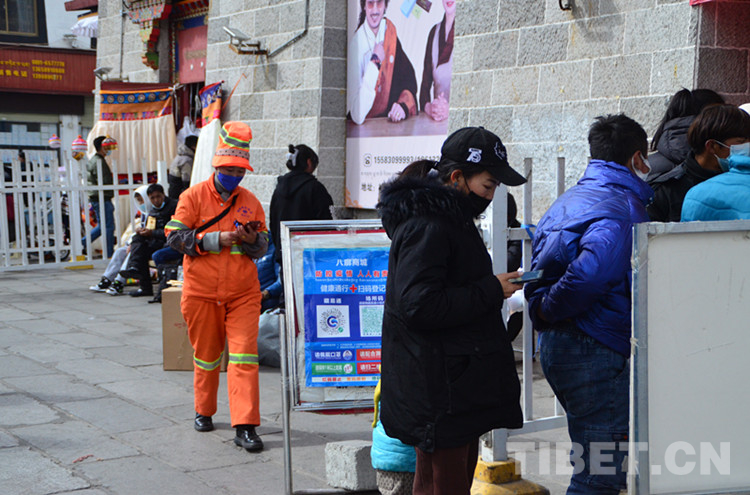 進(jìn)入八廓商城后,提示戴上口罩的廣播便一直在耳邊環(huán)繞。在進(jìn)入商城之前,還需要在入口處完成健康碼掃碼登記、測(cè)量體溫。