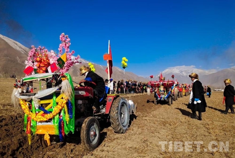 據(jù)悉,儀式當(dāng)日上午,村民們會身著節(jié)日盛裝,歡聚在田間地頭、載歌載舞隆重舉行春耕春播儀式。活動現(xiàn)場,姑娘們舉起手中的切瑪、青稞酒、人參果為犁手們唱歌敬酒,在祝福的歌聲中,開啟春耕“第一犁”。在西藏,過去是牦牛耕地,如今,隨著農(nóng)業(yè)科學(xué)化發(fā)展,現(xiàn)在農(nóng)耕都用現(xiàn)代化的拖拉機“鐵?!备?。一般吉時一到,一個個犁手頭頂金黃圓筒帽,身穿氆氌藏裝駕著一輛輛插著五星紅旗,系著潔白哈達(dá)的“鐵?!本従忨傔M(jìn)田間,一片片沃土隨著鐵犁慢慢翻開,婦女們在后面播撒青稞良種……在田埂上形成一道最靚麗的風(fēng)景線,好不壯觀!