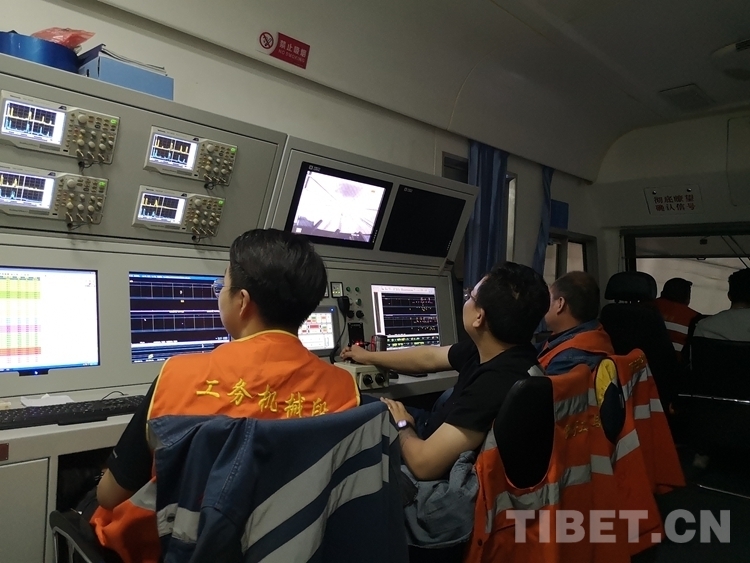 進(jìn)入拉林鐵路前,機(jī)組人員對(duì)鋼軌探傷車檢測(cè)裝置、走行及制動(dòng)系統(tǒng)進(jìn)行了細(xì)致的檢查,對(duì)探傷系統(tǒng)及參數(shù)等進(jìn)行調(diào)試。探傷車前端,兩名司機(jī)緊盯前方,負(fù)責(zé)運(yùn)行;探傷操作臺(tái)前,副隊(duì)長(zhǎng)張全福及4名探傷人員不斷調(diào)整相關(guān)參數(shù),連續(xù)6個(gè)小時(shí)對(duì)檢測(cè)過的鋼軌數(shù)據(jù)進(jìn)行認(rèn)真盯控,通過數(shù)據(jù)變化判斷鋼軌是否存在傷損。