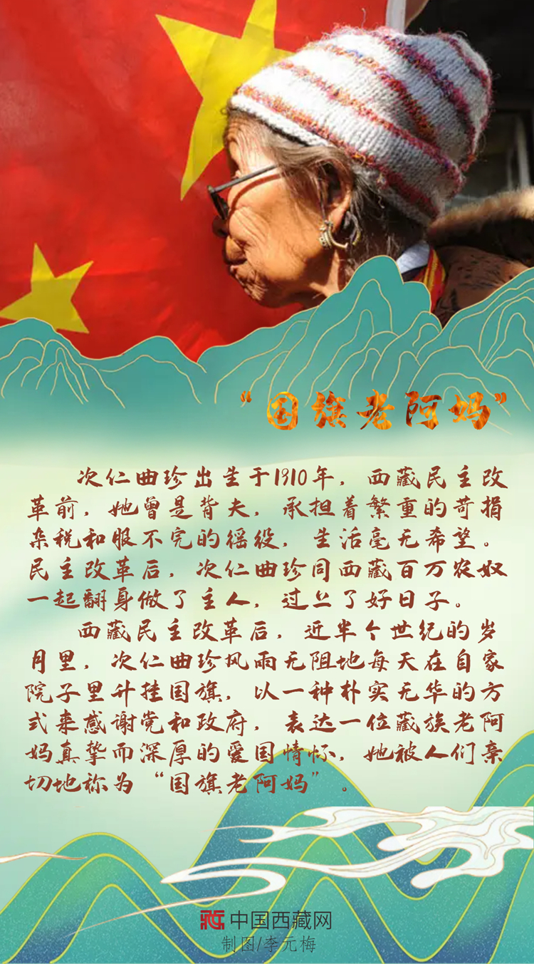西藏民主改革后,次仁曲珍在自家院子里升起國旗,這一升就是近半個(gè)世紀(jì),一天不落,風(fēng)雨無阻。只有經(jīng)歷過舊西藏的人才知道新西藏的可貴,翻身成為國家主人的“國旗老阿媽”,以上萬天堅(jiān)持不渝的行動(dòng)表達(dá)著自己樸素的愛國情懷。