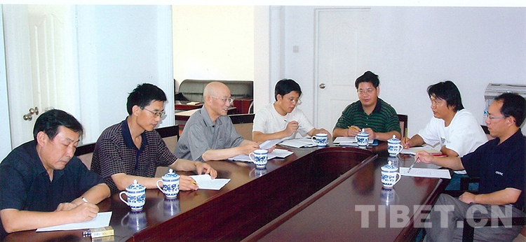 圖為陳慶英先生(左3)主持中國(guó)藏學(xué)研究中心歷史研究所會(huì)議,討論《西藏通史》相關(guān)工作 (圖片由張?jiān)铺峁?/p>