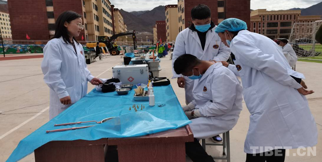 藏醫(yī)藏藥專業(yè)的同學(xué)們在老師的指導(dǎo)下,有條不紊地進(jìn)行著火灸,三兩個同學(xué)一起配合,在“患者”頸部選定穴位,點火,看火,直至火焰熄滅,一次火灸時間為10至15分鐘。在火灸演示后方,同學(xué)們正展示著藏藥足療,濃郁的藥草味、熟練的手法盡顯藏醫(yī)養(yǎng)生療法特色。