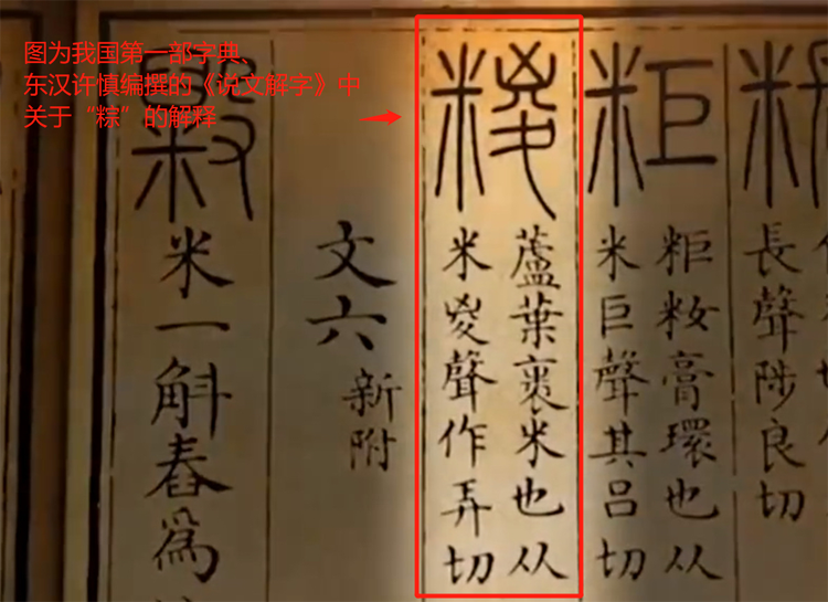 關于粽子,比較早的文字記載,在距今近2000年前,由東漢學者許慎編纂的我國第一部真正意義上的字典《說文解字》中可以找到——“糉,蘆葉裹米也”。這個記載言簡意賅地說明了制作粽子的原料和方法?!凹F”字就是我們現(xiàn)在使用的“粽”字。