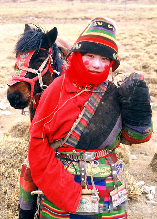 這是藏北申扎縣一位出行的牧女,使用紅顏料在臉頰涂上圓圓的“高原紅”,來(lái)作為美的印記(唐召明1991年攝)
