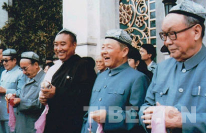圖為習(xí)仲勛(右二)與烏蘭夫(右一)、十世班禪(右三)、賽福鼎?艾則孜(右四)、楊靜仁(右五)在北京民族文化宮。圖片來(lái)源:《中國(guó)西藏》雜志