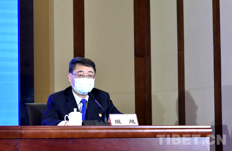 圖為西藏自治區(qū)新型冠狀病毒肺炎疫情防控工作第三場新聞發(fā)布會上,西藏自治區(qū)旅游發(fā)展廳黨組成員、副廳長姬越介紹游客服務保障方面工作 攝影:王媛媛
