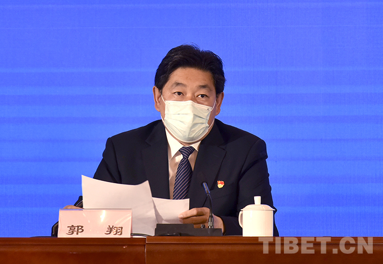 圖為西藏自治區(qū)新型冠狀病毒肺炎疫情防控工作第四場新聞發(fā)布會上,西藏自治區(qū)經(jīng)濟(jì)和信息化廳黨組成員、副廳長、一級巡視員郭翔介紹疫情期間防疫物資保障情況 攝影:王媛媛