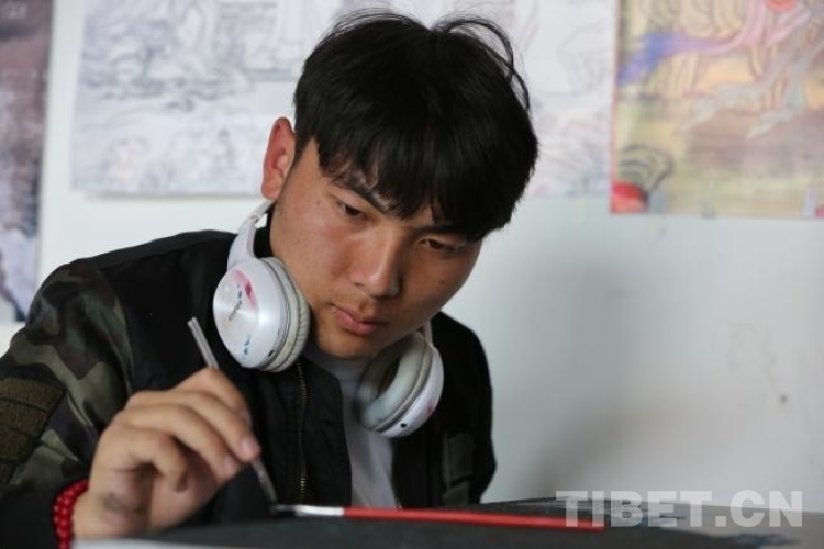 同期學(xué)員中,同樣來自唐卡世家的白瑪旺青,肩負(fù)家族厚望,被父親委派而來。2019年,白瑪旺青的父親學(xué)到半途,家中突然接到《格薩爾王與三十大將》的唐卡長(zhǎng)卷訂單,不得不退學(xué)回到江達(dá)縣家中主持繪制工程。這次,他把兒子白瑪旺青、學(xué)徒桑培和尼瑪布派來學(xué)習(xí),自己帶著46個(gè)學(xué)徒繼續(xù)完成訂制唐卡的繪制?!案赣H對(duì)唐卡漆畫很支持,要求我們認(rèn)真學(xué),學(xué)成后再傳授給他本人和更多的學(xué)徒,”白瑪旺青說,“我和父親覺得,創(chuàng)作漆畫比傳統(tǒng)唐卡快,也會(huì)贏得新的市場(chǎng),能帶動(dòng)更多學(xué)徒增收?!?/p>