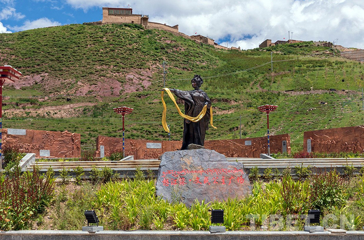 這個溫泉遺址后樹立的是總高9米,由紫銅鍛造而成的文成公主雕像,其身后是金屬鑄造的文成公主和親浮雕墻。墻上通過大唐盛世、古道流芳、福澤吐蕃三個篇章展示了公主進(jìn)藏的整個歷史過程。
