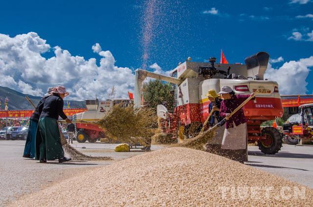 圖為2019年9月6日,2019?西藏“中國農(nóng)民豐收節(jié)”暨扎囊縣氆氌文化節(jié)期間,西藏自治區(qū)山南市扎囊縣羊噶居委會機械化打麥現(xiàn)場 攝影:趙耀
