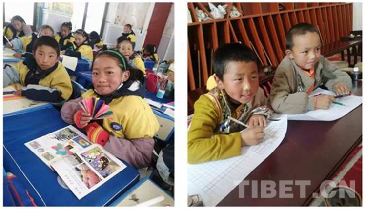 圖為西藏自治區(qū)那曲市比如縣羊秀鄉(xiāng)小學(xué)的孩子們在上手工課(左)和書法課(右) 攝影:米瑪旺久