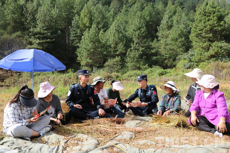 在田間地頭,趁著村民正坐在田坎上休息,“背包民警”向大家介紹:“習(xí)近平總書記在二十大報(bào)告中提出,增進(jìn)民生福祉,提高人民生活品質(zhì)……”“背包民警”邊宣講邊向村民們發(fā)放了自己印發(fā)的黨的二十大精神宣講手冊(cè),據(jù)了解,考慮到轄區(qū)群眾以中老年人為主,大多數(shù)認(rèn)識(shí)漢字不多,所以“二十大精神宣講手冊(cè)”采取圖文并茂的方式,用最通俗易懂的話向群眾解釋二十大報(bào)告的內(nèi)容。