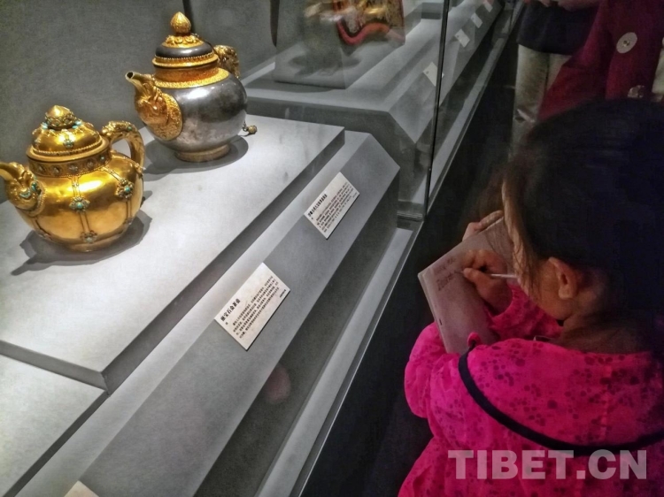 圖為一個小女孩在《天路文華—西藏歷史文化展》展品前做筆記 攝影:李元梅