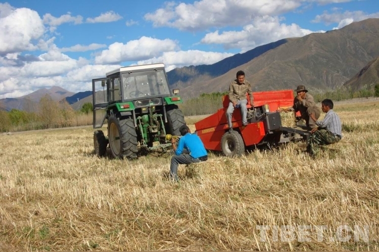 圖為西藏自治區(qū)農(nóng)牧科學(xué)院草業(yè)科學(xué)研究所科技人員正在開展飼用燕麥青干草打捆試驗示范