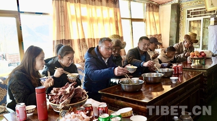 “這些干部和我們相處了這么長時間,都成自家人了。他們家在內(nèi)地,但因為工作必須堅守崗位。我們能做的也不多,就是請他們到家中來吃個簡單的團(tuán)圓飯?!?多章說著,老人的女兒央金熱情地端來酥油茶。