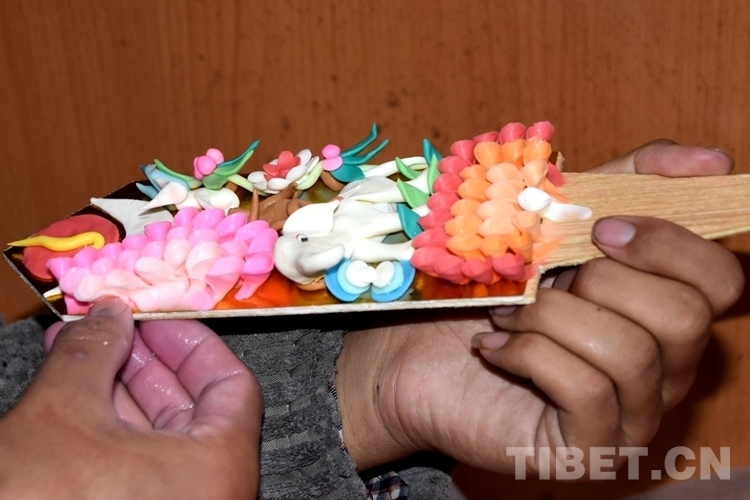 “酥油花手藝是我爸爸教給我的,然后我的弟弟、兒子的手藝是我教給他們的。去年年前一個(gè)月內(nèi),去掉其他開銷,我一個(gè)人賺了一萬(wàn)多。”雖然這活累了點(diǎn)兒,但在農(nóng)閑期間能有這樣一筆收入,對(duì)旦增家來(lái)說(shuō)很可觀。