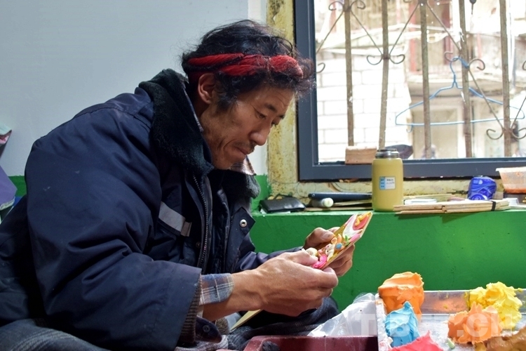 “我們一般在藏歷新年前20天左右到達(dá)拉薩。買酥油,和礦物染色原料調(diào)至成泥狀后便開始捏制。”旦增說(shuō),普松鄉(xiāng)有制作酥油花的傳統(tǒng),每年藏歷新年臨近,他們便結(jié)伴來(lái)到拉薩制作酥油花銷售。