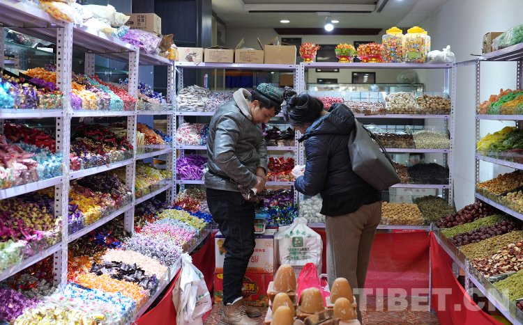 在八廓商城附近的一家門店里,來自新疆當(dāng)?shù)氐暮吞锎髼?、天山沙棗、葉城核桃、大白杏干、馬奶子葡萄干、天山烏梅、巴旦木等,因食材地道、品質(zhì)優(yōu)良格外受到拉薩市民的青睞。老板是位“00”后維吾爾族青年,頭腦靈活,待人熱情,近日來持續(xù)火爆的生意更是讓他高興得合不攏嘴。上門購(gòu)物的顧客有藏族、漢族、回族等民族,他們除了購(gòu)買地道的新疆干果,還會(huì)購(gòu)買該店專為藏歷新年新上的大白兔奶糖、彩色硬質(zhì)水果糖、果汁軟糖、巧克力、棒棒糖、藏式奶渣等貨品。人們用漢語加手勢(shì)比劃著交流,溝通無礙,再加上移動(dòng)支付方便快捷,老板誠(chéng)信經(jīng)營(yíng),顧客們總能高興而來,滿意而歸。