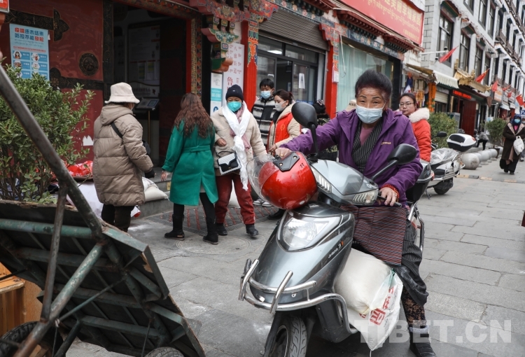 圖為社區(qū)工作人員阿旺曲宗幫居民搬運糧油 攝影:呂靜