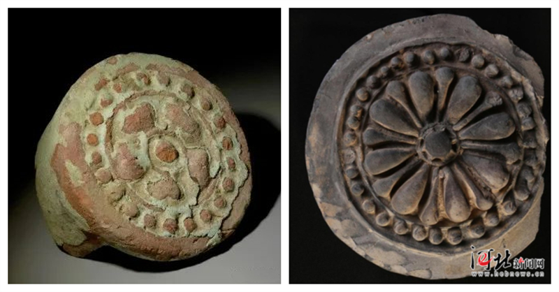 圖為西藏曲水溫江多遺址出土的綠釉紅陶帶筒瓦蓮花瓦當(dāng)(左圖片來源:國家文物局)與河北正定開元寺附近出土的唐代蓮花紋瓦當(dāng)(圖右圖片來源:燕趙都市報(bào))紋樣對(duì)比