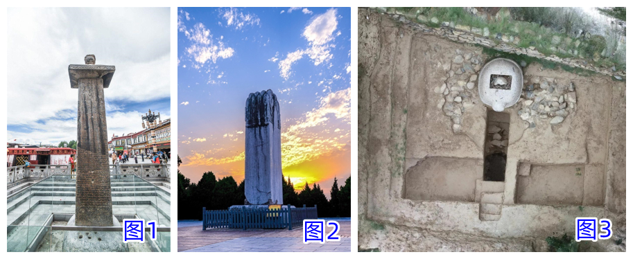圖1為拉薩大昭寺前的唐蕃會(huì)盟碑 圖片來源:中國西藏網(wǎng);圖2為唐乾陵的無字碑 圖片來源:中國乾陵網(wǎng)站;圖3為西藏曲水溫江多遺址龜趺及房址 圖片來源:國家文物局