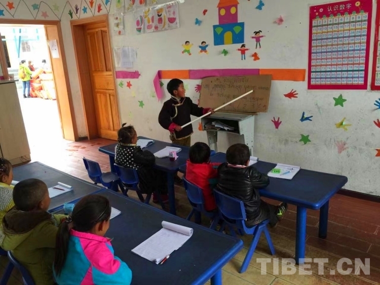圖為山南洛扎縣生格鄉(xiāng)的學(xué)校(含幼兒園到小學(xué)3年級),孩子使用老師做的詞卡做小老師 2016年拍攝