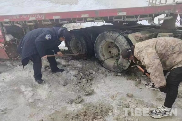 民警抵達(dá)現(xiàn)場(chǎng),首先確認(rèn)了司機(jī)身體狀況良好。在了解情況后,與司機(jī)共同對(duì)車輛開展救援工作。經(jīng)過一段時(shí)間努力,仍無法將被困車輛拖離被困地。經(jīng)與司機(jī)協(xié)商決定,先行將其帶至曲松鄉(xiāng)妥善安頓,而后協(xié)調(diào)駐地友鄰單位用重型車輛救援被困車輛。最終在友鄰單位的幫助下,被困近20小時(shí)的半掛車成功脫困。