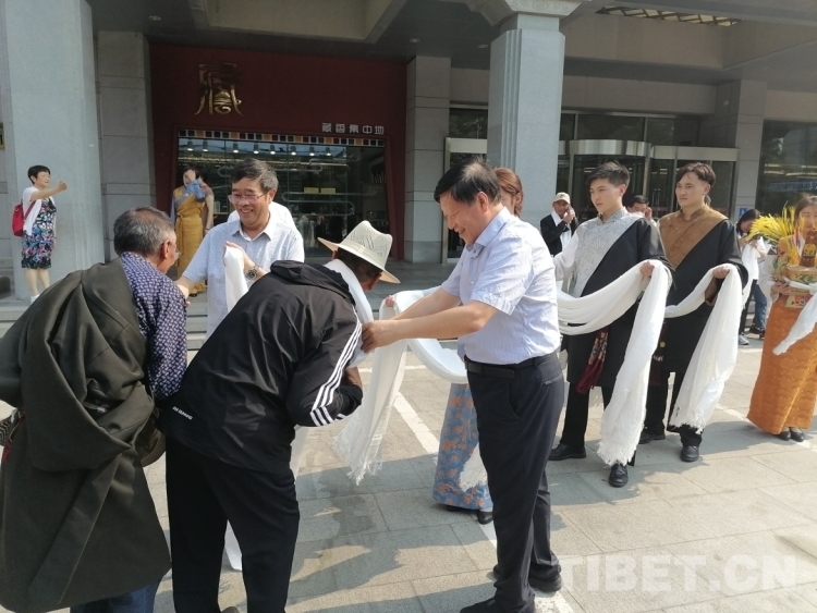 圖為北京建藏援藏工作者協(xié)會相關(guān)負責(zé)人為西藏村居兩委基層干部赴京考察學(xué)習(xí)團獻上哈達 攝影:王茜