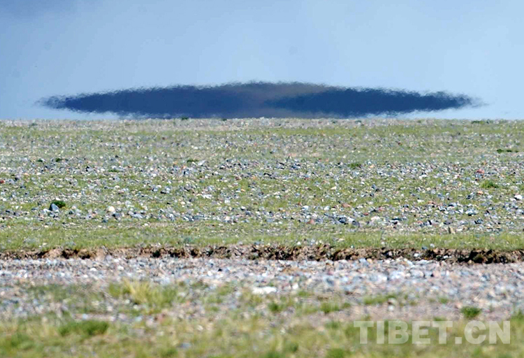 出現(xiàn)在羌塘國家級自然保護(hù)區(qū)的形似飛碟的海市蜃樓。海市蜃樓是因空氣中不斷升騰的水汽將光線折射而形成(唐召明2009年8月2日攝)