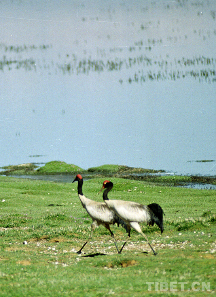 在藏北草原上漫步的國家一級保護(hù)動物、被稱為”鳥類熊貓“的黑頸鶴(唐召明2001年攝)