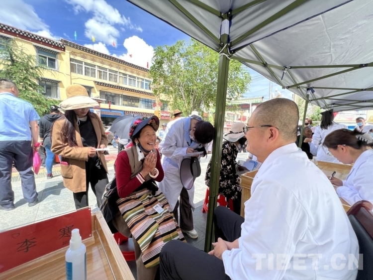 “從首都老遠(yuǎn)跑來給我們看病送藥,嘎真切(感謝)、故次仁(愿您長壽)?!毕虬颓谠诠强屏x診點(diǎn)給來自北京海淀區(qū)花園路社區(qū)衛(wèi)生服務(wù)中心主任李寒看完膝蓋、胳膊、肩膀等關(guān)節(jié)病后一會(huì)兒雙手合十、一會(huì)兒舉起大拇指、一會(huì)兒又跟李醫(yī)生握手表達(dá)著心中的感謝之情。