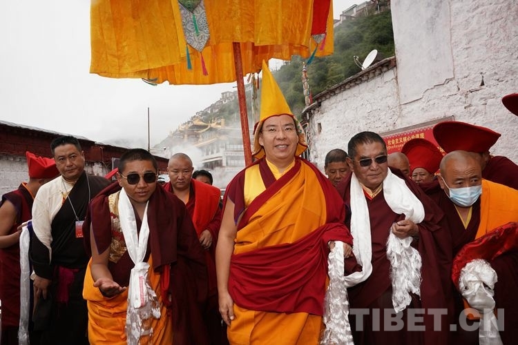 當(dāng)日11時(shí)許,在眾僧的期盼中,班禪一行抵達(dá)直孔替寺。頓時(shí),現(xiàn)場(chǎng)法號(hào)齊鳴、法螺合奏,直孔瓊倉·洛桑強(qiáng)巴活佛和僧眾在寺廟前舉行了隆重的歡迎儀式。