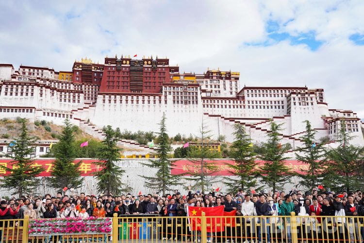 圖為升旗儀式結束后各族群眾在布達拉宮廣場前合影。 攝影:王淑