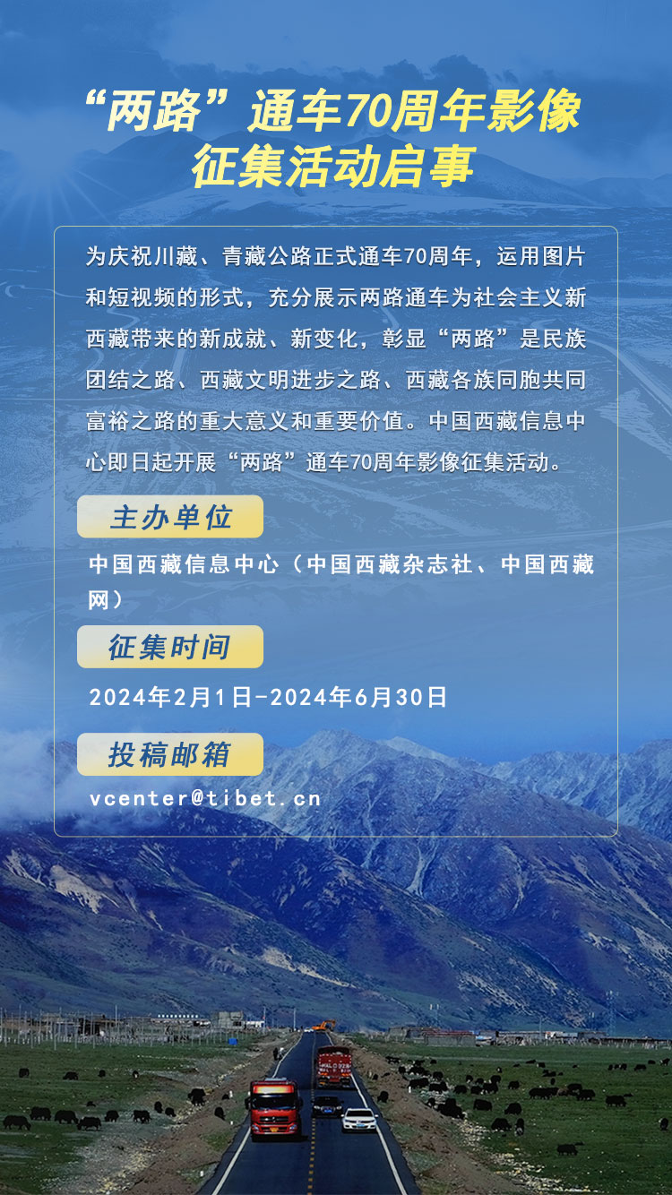 為慶祝川藏、青藏公路正式通車70周年,運(yùn)用圖片和短視頻的形式,充分展示兩路通車為社會主義新西藏帶來的新成就、新變化,彰顯“兩路”是民族團(tuán)結(jié)之路、西藏文明進(jìn)步之路、西藏各族同胞共同富裕之路的重大意義和重要價(jià)值。中國西藏信息中心即日起開展“兩路”通車70周年影像征集活動。
